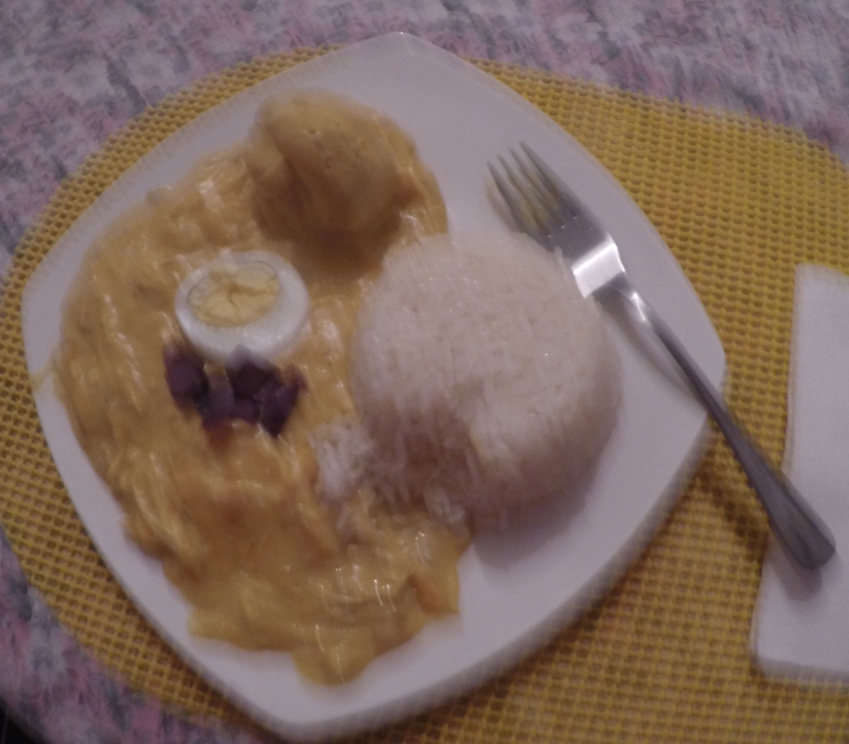 1. Aji de gallina: Karen and I both agree that this is the best meal we’ve eaten since arriving in Peru. Translated as “chili chicken,” this dish consists of a heavy cream served over chicken (or hen), potatoes and rice. Hard-boiled egg and sliced olives garnish the top!